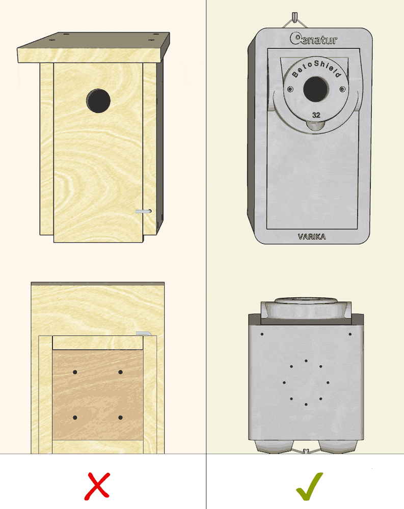 • Für größtmögliche Nesträubersicherheit wird empfohlen, den Fluglochdurchmesser für die präferierte Vogelart so klein zu halten, wie unbedingt nötig. So genügt beispielsweise für Kleinmeisen schon ein Durchmesser ab 25 mm. Beim Ort der Anbringung sollte darauf geachtet werden, Nistkästen für potenzielle Nesträuber möglichst unzugänglich zu platzieren, z.B. an einer Stelle hoch über dem Boden, an der keine Äste oder andere Gegenstände in unmittelbarer Umgebung vorhanden sind, damit Nesträubern das Erreichen durch Klettern oder Springen erschwert bzw. unmöglich gemacht wird. Auch zusätzliche Maßnahmen wie z.B. Abwehrgürtel können das Erreichen von Nistkästen durch Nesträuber verhindern.