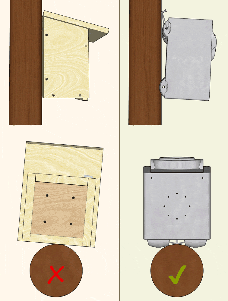 • Die Temperatur in Nistkästen ist mitunter abhängig vom Montageort. Generell wird ein schattiger Platz empfohlen, an dem Nistkästen nicht zu lange über den Tag hinweg direkter Sonneneinstrahlung ausgesetzt sind. Mittagssonne sollte vermieden werden.